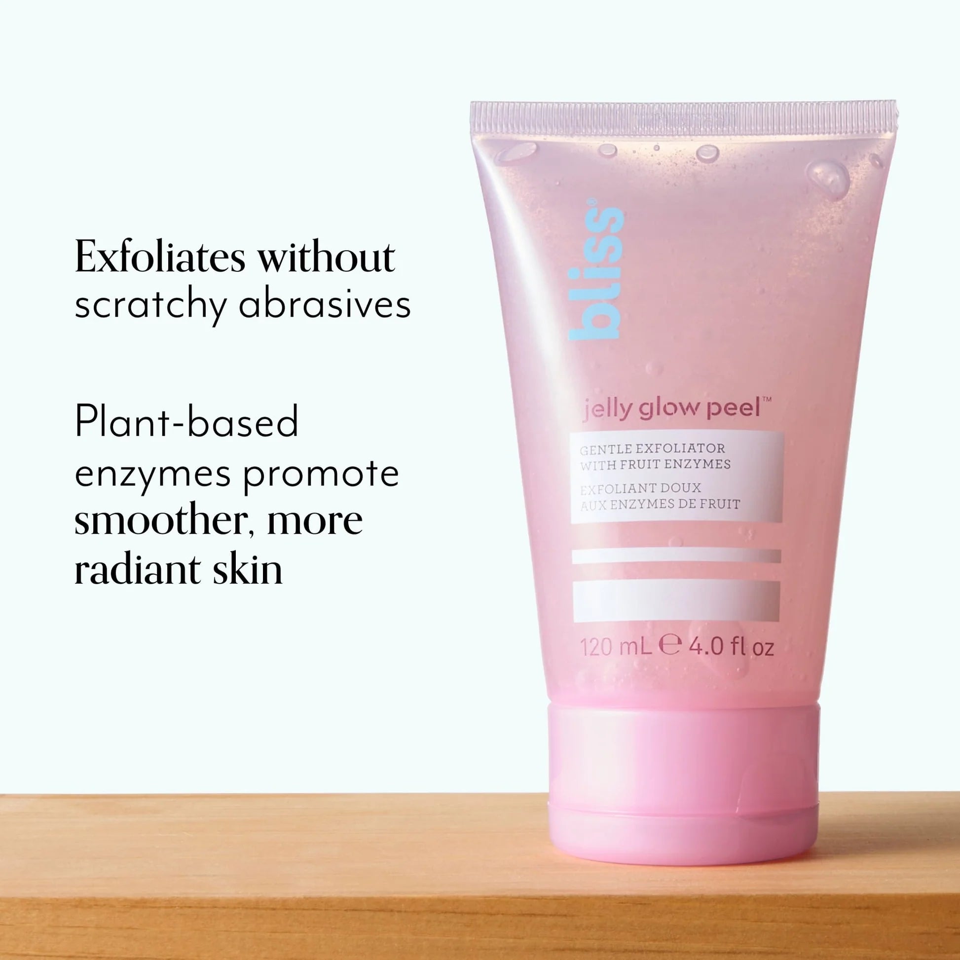 Feel the peel! This gentle jelly exfoliator has soft plant-based fibers and fruit enzymes to capture and slough away dry, flaky skin – no harsh scrubbing required!
